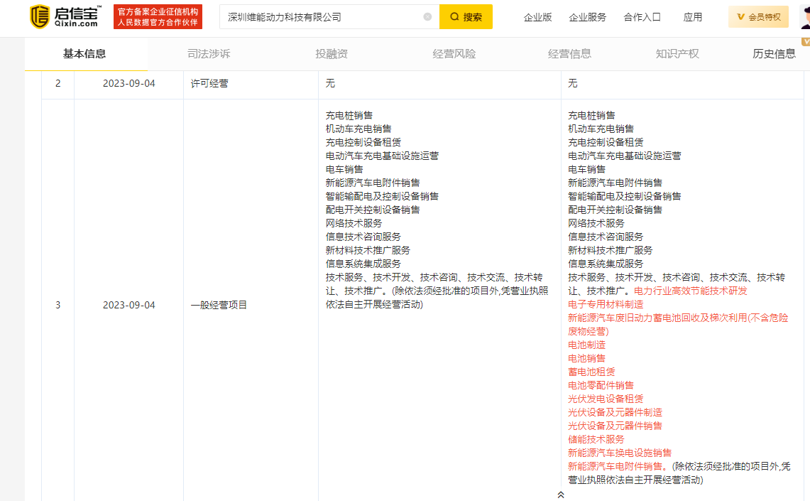 深圳维能动力科技有限公司法定代表人是李彬,公告称其有17年从事充电桩销售、机动车充电销售、充电控制设备租赁等相关业务工作经验。然而这家公司在9月4日才增加电池回收、储能技术、新能源换电等涉及电池的经营项目。