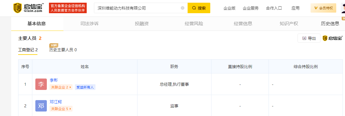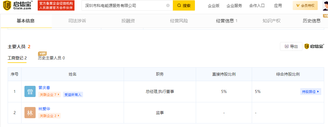公告称深圳市科电能源服务有限公司的主要人员涉及邓江柯,其有8年丰富的财务管理经验。然而该公司的主要管理人员并没有这个人,反而此人的名字出现在深圳维能动力科技有限公司。