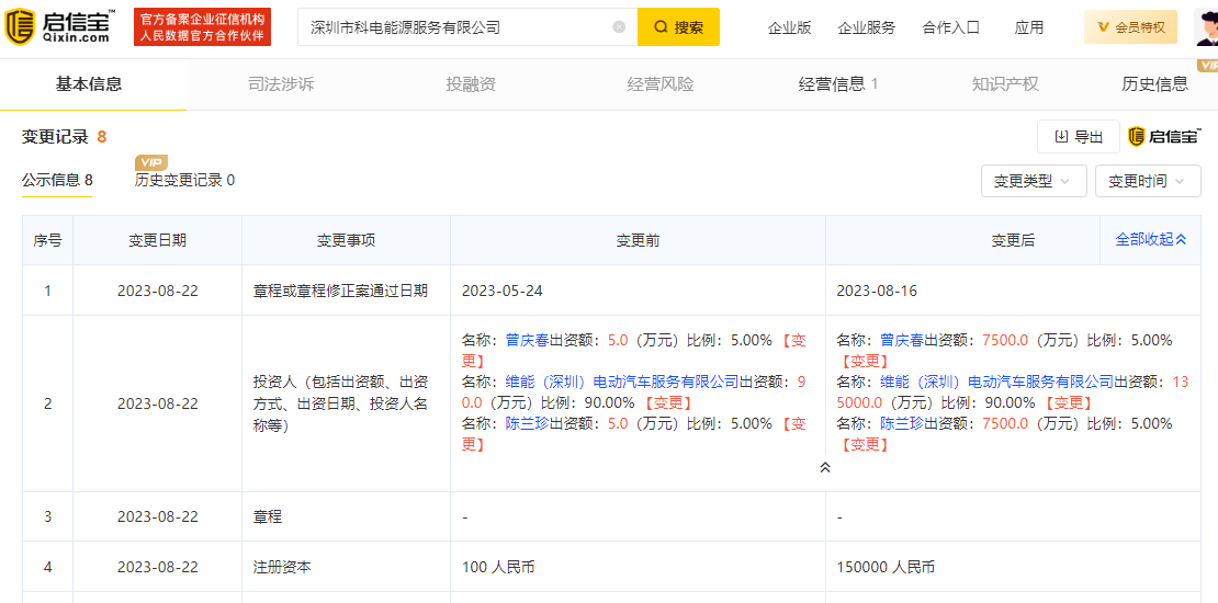 深圳市科电能源服务有限公司则在8月22日将注册资本由100万元增加至15亿元。