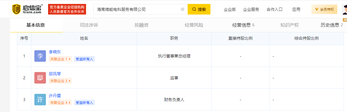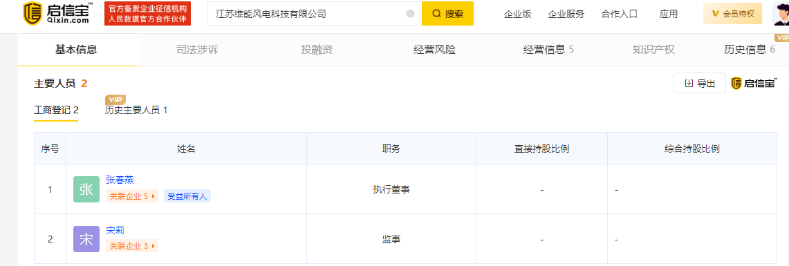类似的情况还出现在公告提及的江苏维能风电科技有限公司身上,公告称该公司主要人员“许丹雯,具备12年行业经验。”然而,江苏这家公司的工商资料并没有此人,其反而以“财务负责人”的身份出现在海南维能电科服务有限公司。