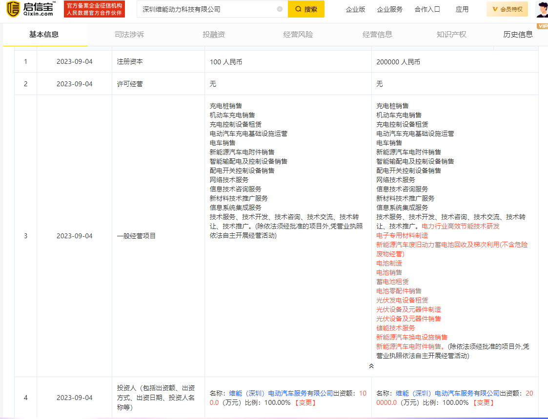 深圳维能动力科技有限公司在9月4日变更了工商资料:注册资本由100万元增至20亿元,一般经营项目增加了电池制造、电池销售等。