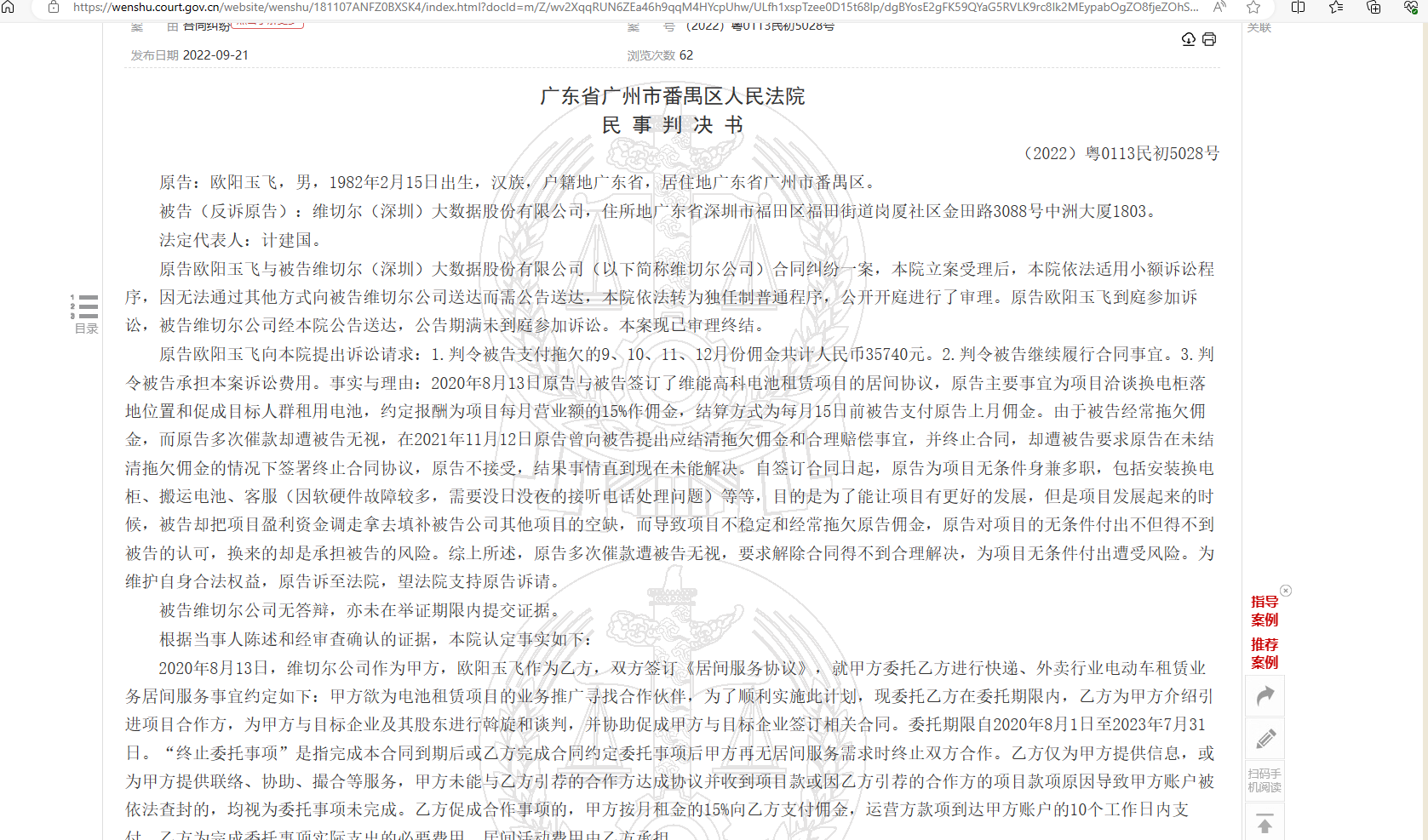 根据2022年6月30日的一审民事判决书,欧阳玉飞与维切尔(深圳)大数据股份有限公司(维能(深圳)大数据股份有限公司更名前)出现合同纠纷。2020年8月13日,双方签订了维能高科电池租赁项目的居间协议,欧阳玉飞的主要事宜为项目洽谈换电柜落地位置和促成目标人群租用电池,约定报酬为项目每月营业额的15%作佣金。根据欧阳玉飞的陈述,项目发展起来时,维切尔(深圳)大数据股份有限公司把项目盈利资金调走拿去填补被告公司其他项目的空缺,而导致项目不稳定和经常拖欠原告佣金。