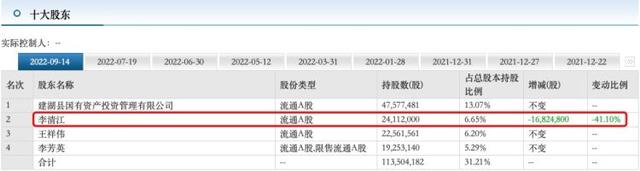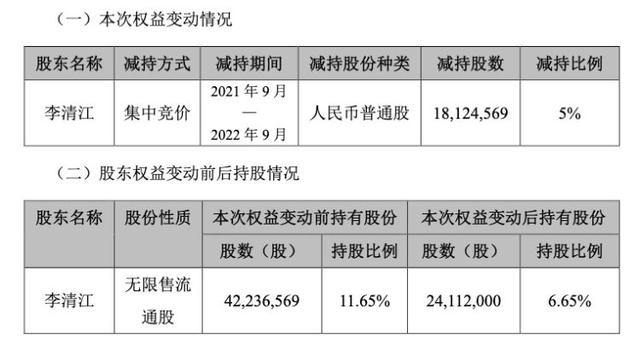 记者查阅资料发现,截至9月14日最新披露的前十大股东持股情况显示,李清江持股数量有所下降,减持1682.48万股,减持后持股数量为2411.20万股。这意味着,若本次减持计划实施完毕后,李清江将清仓公司全部股份。