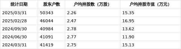 从4月28日公开信息显示,天润工业截至2025年3月31日公司股东户数为5.03万户,较上期(2025年2月28日)增加4299户,增幅为9.34%,持股趋于分散。