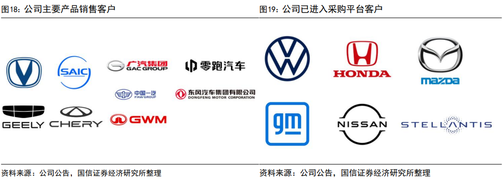 公司客户广泛覆盖国内外主要车企。公司的产品销售网络覆盖了国内各大知名的整车企业,如长安、吉利、长城、上汽、广汽、一汽、东风、奇瑞、零跑、合众等和国际著名的汽车跨国公司,出口南北美、欧洲、中东、东南亚等国家和地区,已进入了大众、通用、本田、日产、Stellantis(原PSA)、马自达等采购平台。