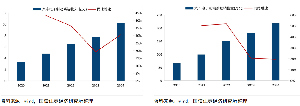 汽车基础制动系统为公司基盘,收入规模持续增长。2024年公司基础制动系统收入约为31亿元,占公司收入整体的73%,对应基础制动系统销量2306.74万只,产品销量及收入规模稳健增长。