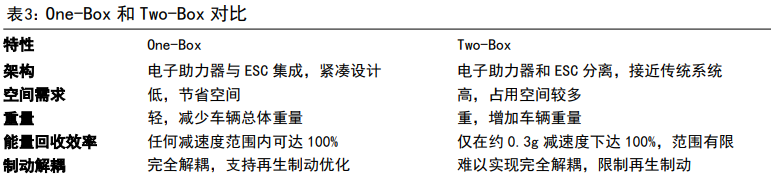 One-box方案逐步确定。EHB根据电子助力器和ESC单元是否集成可以分为One-Box和Two-Box两种方案。One-Box方案将电子助力器和ESC集成,能够独立执行所有制动功能,包括服务制动、踏板感觉模拟、故障备份、主动制动、轮缸液压控制、ABS、ESC及其他车辆安全和舒适控制功能。通过电磁阀完全隔离制动踏板和轮缸,它实现了完全的制动解耦。Two-Box方案包括独立的电子助力器和ESC单元,遵循传统液压制动系统的架构,具备一定的安全冗余。根据佐思汽研数据,24H1国内One-Box占比上升至75.9%,较去年同期增加17.4个百分点。One-box方案逐步确定。