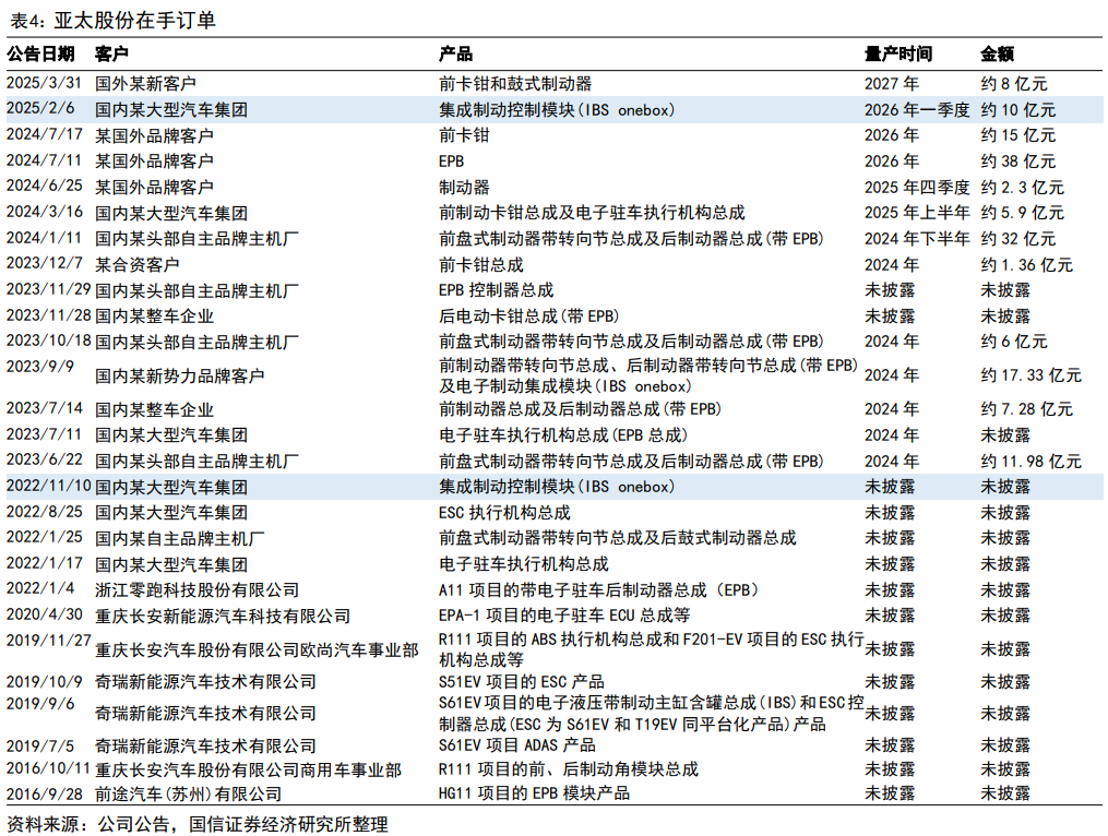 在手订单加速拓展,远期持续贡献收入增量。公司在手项目充足,线控制动、EPB出海等业务加速推进。2024年公司新启动166个项目,其中有74个项目涉及汽车电子控制系统产品。公司新量产103个项目,包括零跑汽车、一汽红旗、重庆长安、吉利汽车、广汽埃安、长城汽车、上汽大通等多个项目。2025年公司新获国内某大型汽车集团IBS定点,预计26Q1量产,生命周期贡献10亿元收入。