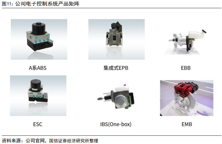 公司电子控制系统产品种类丰富,EPB贡献主要收入,IBS加速业绩释放。公司的汽车电子控制系统产品以自研ABS(汽车防抱死制动系统)为基础,逐步实现各类汽车底盘电子制动系统产品布局;包括EPB(电子驻车制动系统)、ESC(汽车电子操纵稳定系统)、IBS(Two-Box,解耦式电子助力制动系统)、EBB(Two-Box,非解耦式电子助力制动系统)、IBS(One-Box,智能制动系统)、EMB(电子机械制动系统)等。