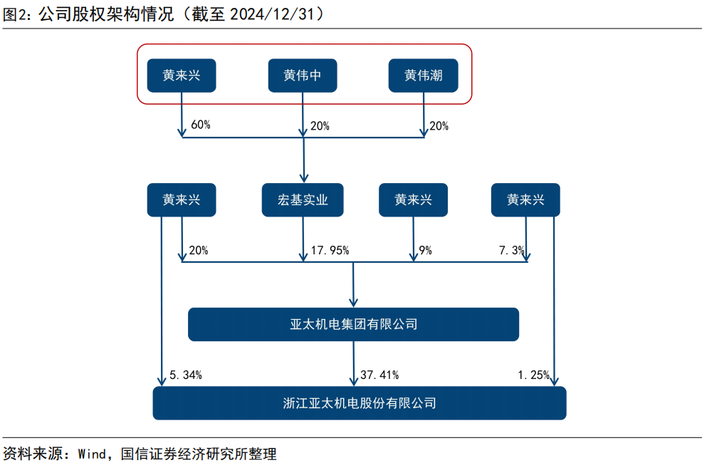 公司股权结构稳定,黄氏父子(黄来兴及其长子黄伟中、次子黄伟潮)及其一致行动人合计持股公司44%,其中黄氏父子直接持有公司6.59%股权;黄氏父子控股的亚太集团持有公司37.41%股权。截至2024年12月31日,黄氏父子为公司的实际控制人。其中,黄来兴直接持有公司5.34%的股份,其长子黄伟中是公司现任董事长,直接持有公司1.25%的股份,其次子黄伟潮是公司现任副董事长,黄氏父子通过亚太机电集团间接持有公司20%股份。