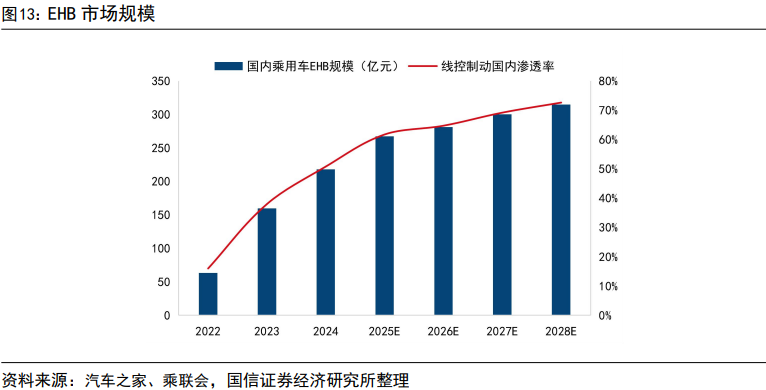 EHB适配新能源车制动需求,渗透率与新能源车渗透率同步提升。根据佐思汽研的数据统计,2024年上半年,EHB线控制动装配量接近400万台,同比增长101%,装配率突破40%,相较去年同期增加19.9个百分点。结合佐思汽研及盖世汽车数据,我们预计2025年国内乘用车线控制动市场规模为265亿元,2028年预计提升至315亿元水平。线控制动满足新能源汽车无真空动力源、对系统响应速度要求高、制动能量回收等一系列需求,受益于电动化、智能化,渗透率持续提升。