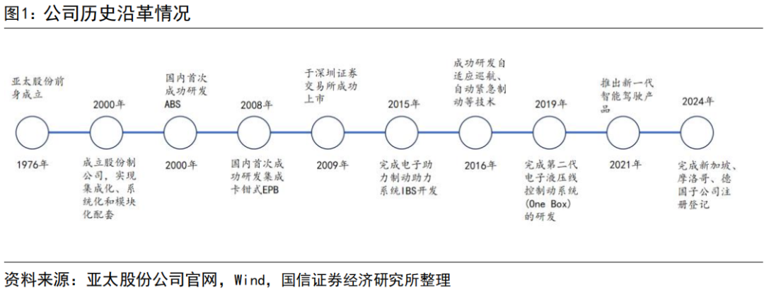专注制动系统持续突破技术与市场布局。1976年公司前身成立,2000年成立股份制公司,实现集成化、系统化和模块化配套,同年国内首次成功研发ABS;2008年国内首次成功研发集成卡钳式EPB;2009年于深圳证券交易所成功上市;2015年完成电子助力制动系统IBS开发;2016年成功研发自适应巡航、自动紧急制动等技术;2019年完成第二代电子液压线控制动系统(One Box)研发;2021年推出新一代智能驾驶产品;2024年完成新加坡、摩洛哥、德国子公司布局。