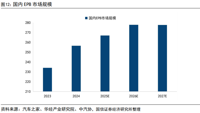 EPB是传统机械手刹的电子化升级方案,通过电机驱动替代手动拉杆,2025年市场规模有望达近270亿元水平。EPB通过驾驶员按下驾驶舱内开关,控制器接收信号后确认车辆状态,若满足驻车条件,向电机发送启动指令,电机驱动传动机构(如丝杠),推动制动卡钳活塞压紧刹车盘(或鼓),产生驻车制动力。当制动力达到设定阈值(如刹车片贴合压力),电机停止转动,机械锁止机构(如齿轮棘轮)锁定当前位置,保持驻车力。根据华经产业研究院数据,2023年国内EPB前装渗透率接近90%,结合中汽协数据,我们测算2025年国内EPB市场有望达到近270亿元水平,国产化率快速提升。
