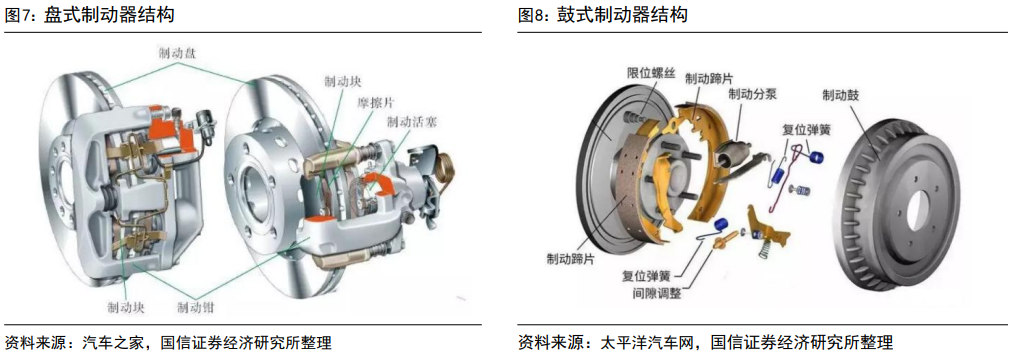 汽车基础制动系统主要为盘式制动器及鼓式制动器两类。当前汽车整体仍处于液压制动阶段,即借助油液执行制动摩擦;常见的为鼓式制动器和盘式制动器两种。盘式制动器由制动盘、制动钳、摩擦片、分泵及油管等组成,通过高压油液进入推盘回路,活塞作用下刹车片与制动盘产生摩擦实现制动。盘式制动器整体采用敞开式设计,能够均衡散热与制动性能,相应产品价格较高;鼓式制动器由制动轮缸、制动蹄、制动鼓、摩擦片及回位弹簧等组成,通过液压装置推动摩擦片摩擦制动鼓内侧面实现制动。制动速度更快、产品成本较低,但是半封闭结构存在散热问题,连续作用可能出现热衰减影响效果。典型的搭载鼓式制动器的大型卡车往往会在下坡过程中以水冲刷车轮刹车盘,实现降温效果。