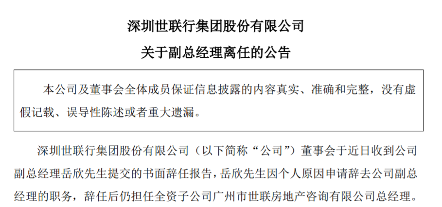 深圳世联行集团股份有限公司(以下简称“公司”)董事会于近日收到公司副总经理岳欣提交的书面辞任报告,岳欣因个人原因申请辞去公司副总经理的职务,辞任后仍担任全资子公司广州市世联房地产咨询有限公司总经理。