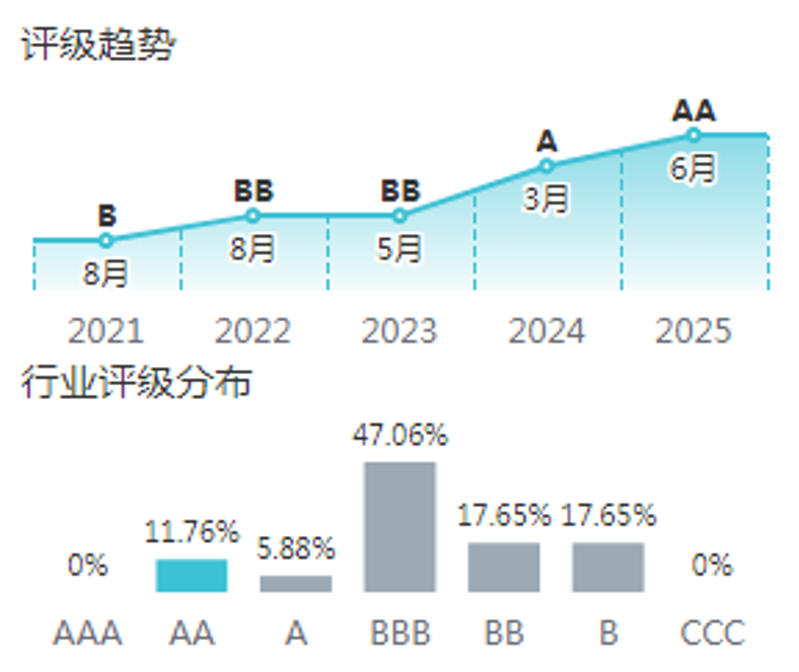 近日,万得(Wind)公布2025年ESG评级结果,世联行凭借环境、社会和治理(ESG)等维度取得的成果,Wind ESG评级由A上调至AA,评级持续提升。Wind ESG评级房地产服务板块共有17家行业企业,世联行排名位于行业第1名,充分展现出世联行体系化管理水平与可持续发展综合实力。