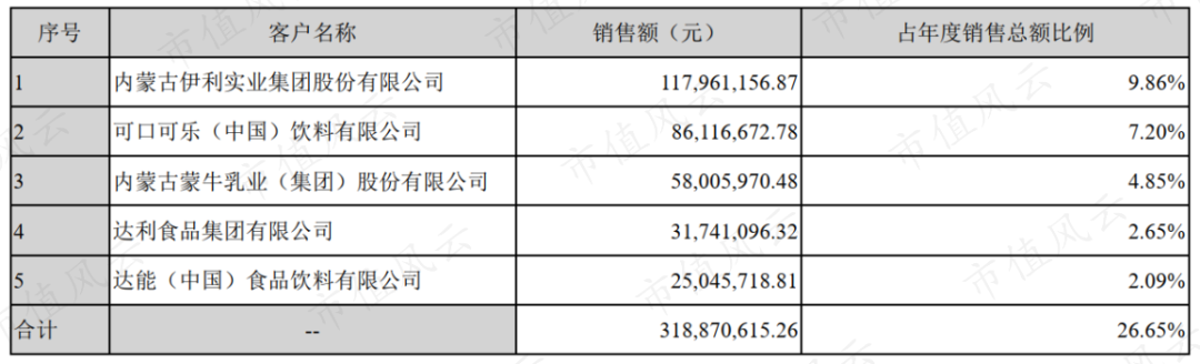 截止2015年,公司前五大客户包含可口可乐、伊利、蒙牛、达利和达能集团,每年都非常稳定。