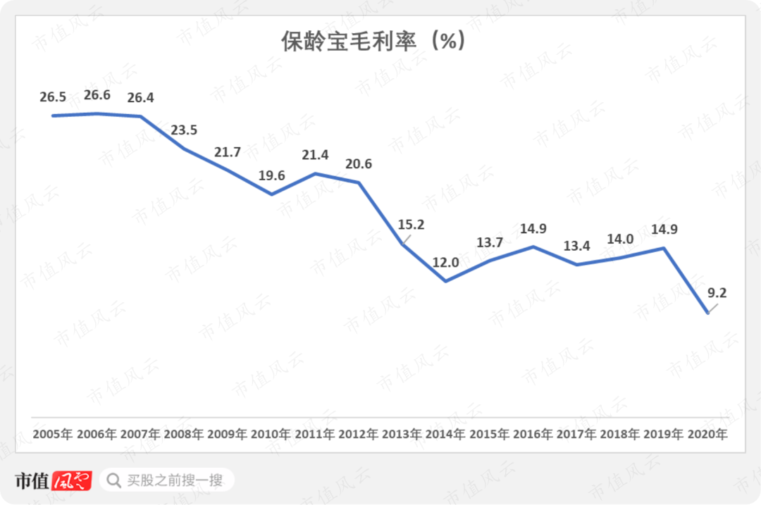 保龄宝的毛利率从2005年的26.5%下跌至2014年的12%,随后小幅回升至14.9%,2020年再度大跌至9.2%。