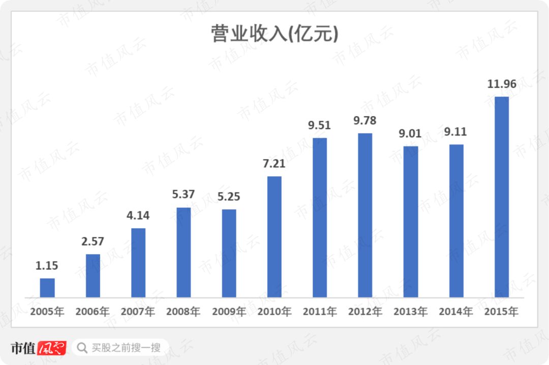 在刘老板的努力下,营业收入蒸蒸日上,从2005年的1.15亿上升至2015年的11.96亿,复合增速达26.4%。