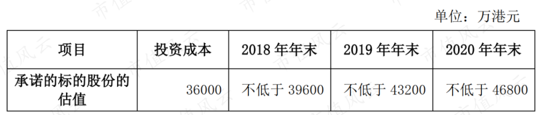 第三个饼,全辉控股承诺每年估值会有10%的增长,2020年3.6亿港币的股权将上升至4.68亿,否则就赔钱。