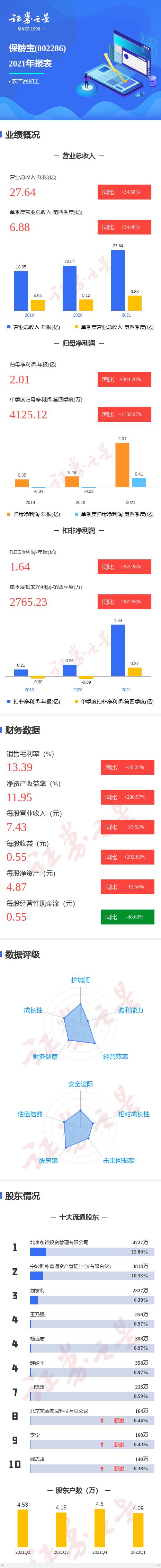 保龄宝2021年报显示,公司主营收入27.65亿元,同比上升34.58%;归母净利润2.02亿元,同比上升304.28%;扣非净利润1.64亿元,同比上升353.28%;其中2021年第四季度,公司单季度主营收入6.88亿元,同比上升34.4%;单季度归母净利润4125.13万元,同比上升1182.97%;单季度扣非净利润2765.23万元,同比上升387.68%;负债率40.14%,投资收益1404.01万元,财务费用1715.93万元,毛利率13.39%。