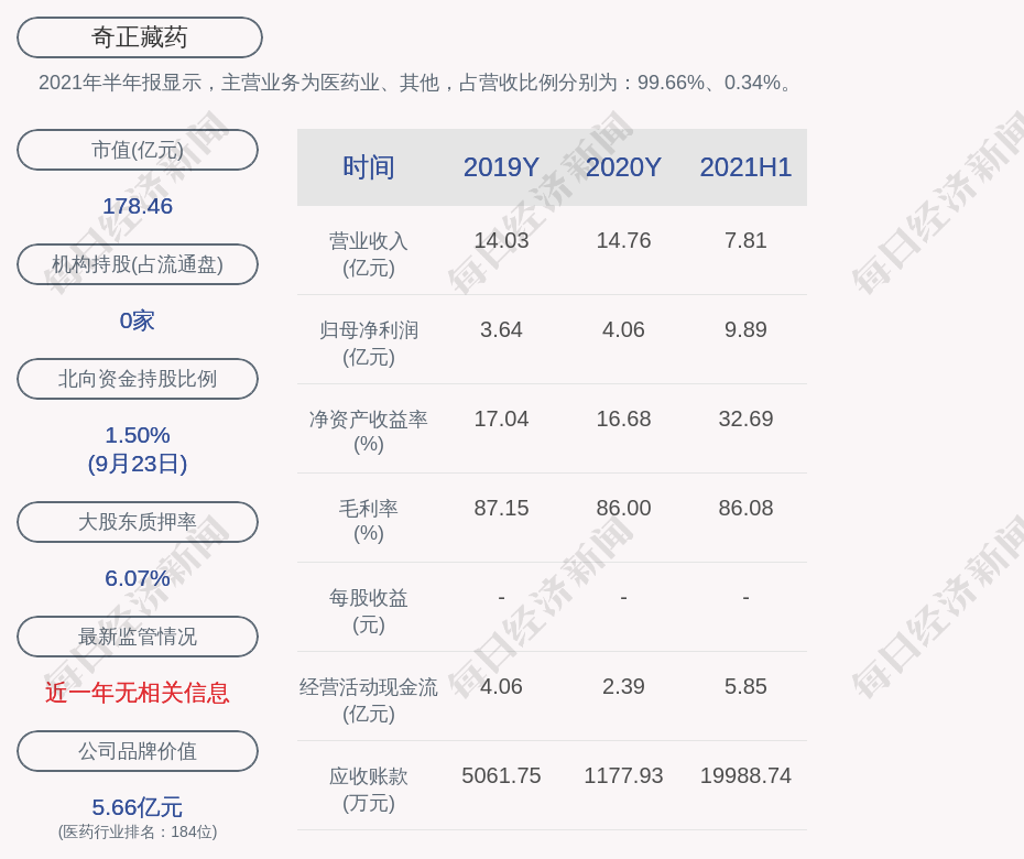 2021年半年报显示,奇正藏药的主营业务为医药业、其他,占营收比例分别为:99.66%、0.34%。