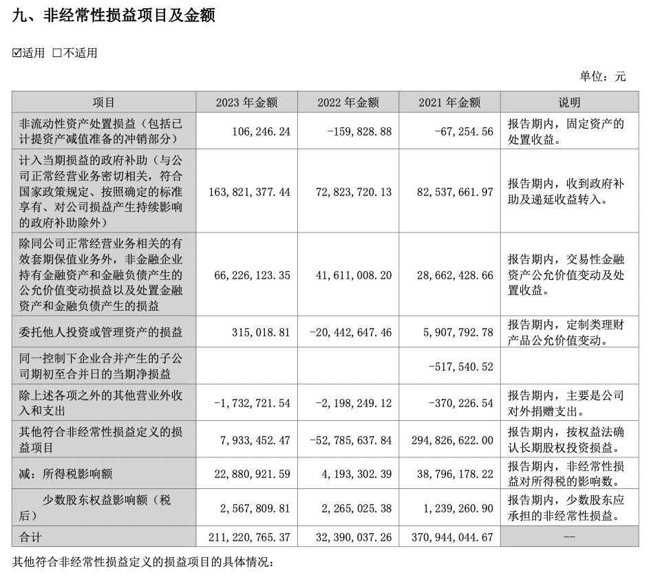 当期,公司非经常性损益金额为2.11亿元,其中计入当期损益的政府补助以及递延收益转入1.64亿元,而上年同期为7282.37万元。