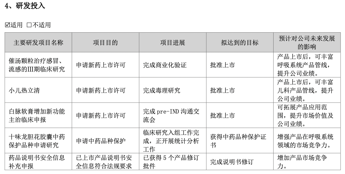 在新药研究方面,公司的新药催汤颗粒完成商业化验证;儿童用药小儿热立清颗粒临床前药学研究完成药效安全性研究;推进白脉软膏增加糖尿病周围神经病变新适应症申请,目前完成CDE沟通交流会。