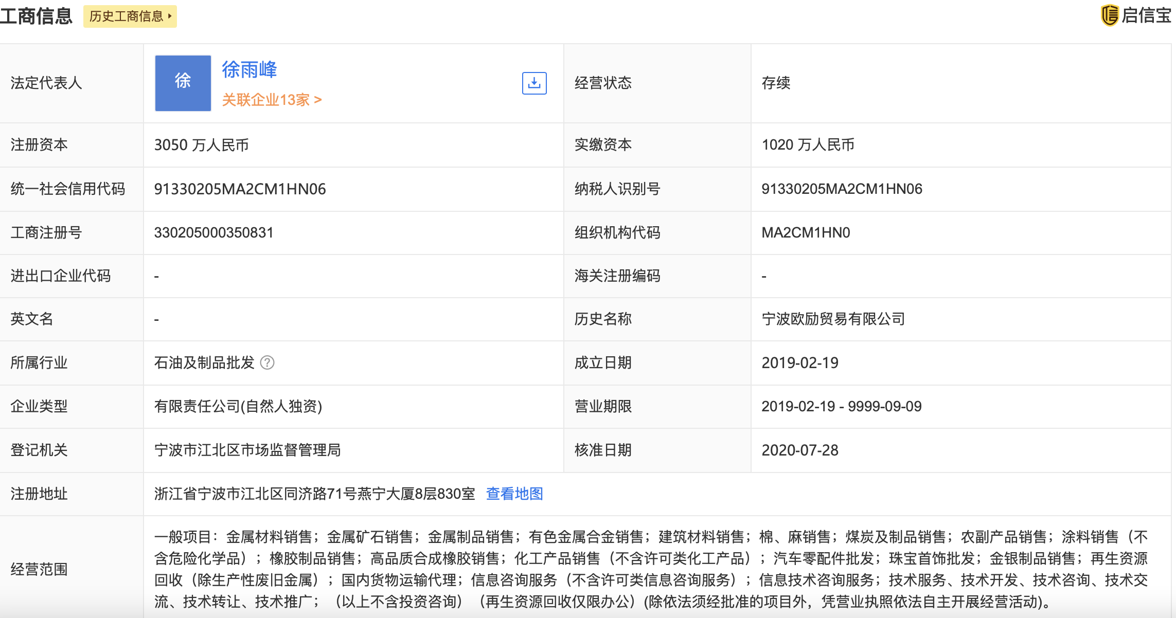 据了解,宁波欧励于2019年2月成立,注册地址位于浙江省宁波市,经营范围包括“金属材料销售、金属矿石销售、金属制品销售、有色金属合金销售”等。
