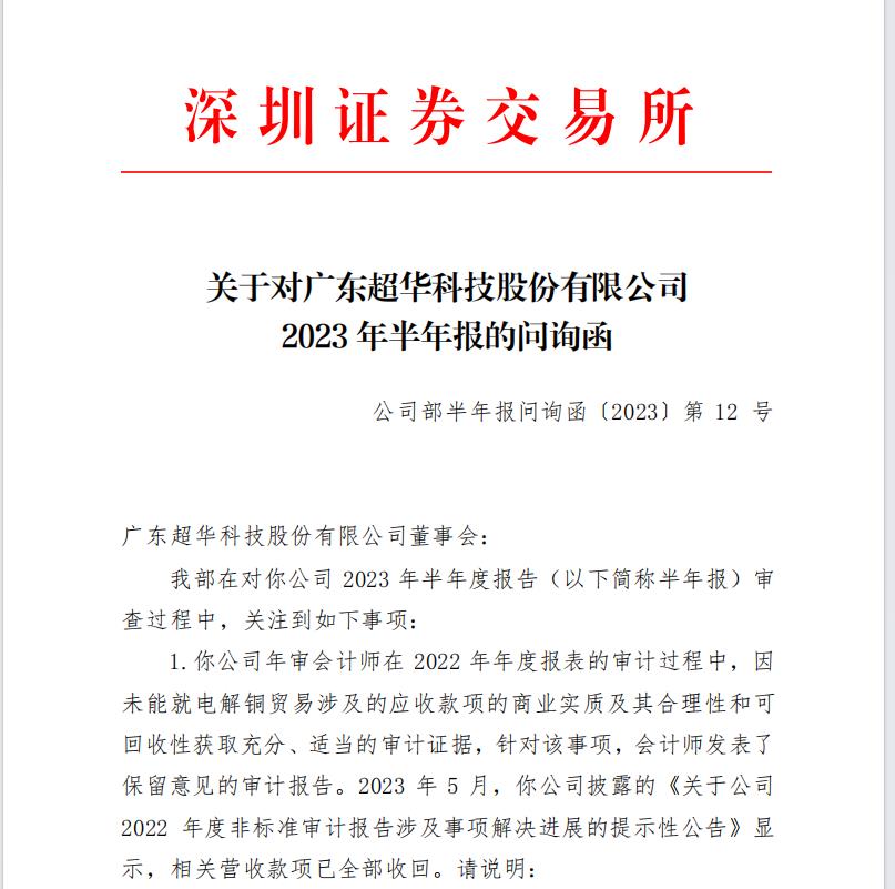 问询函指出,公司年审会计师在2022年年度报表的审计过程中,因未能就电解铜贸易涉及的应收款项的商业实质及其合理性和可回收性获取充分、适当的审计证据,针对该事项,会计师发表了保留意见的审计报告。2023年5月,超华科技公司披露的《关于公司2022年度非标准审计报告涉及事项解决进展的提示性公告》显示,相关营收款项已全部收回。