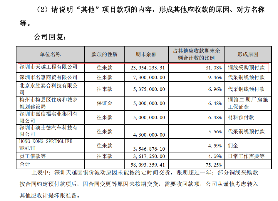 超华科技则在回函中透露,截至今年6月末,公司与天越工程之间的往来款期末余额为2395.42万元,占公司其他应收款期末余额合计数的比例为31.03%,往来款形成原因是铜线采购预付款。