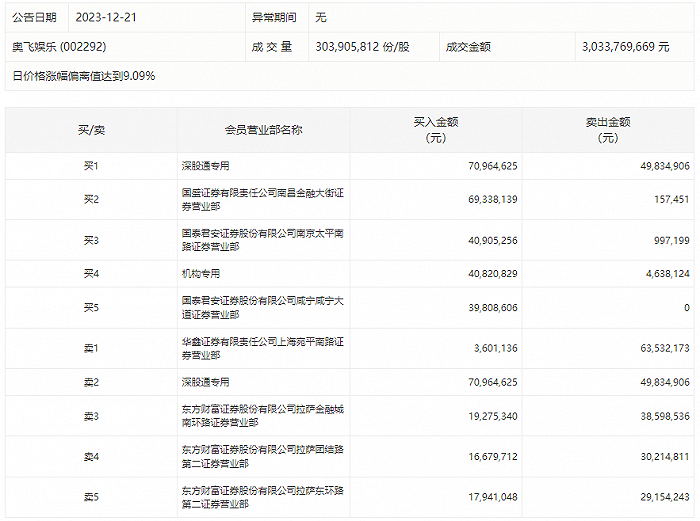 12月21日,奥飞娱乐今日涨停,龙虎榜数据显示,上榜营业部席位全天成交5.36亿元,占当日总成交金额比例为17.68%。其中,买入金额为3.19亿元,卖出金额为2.17亿元,合计净买入1.02亿元。