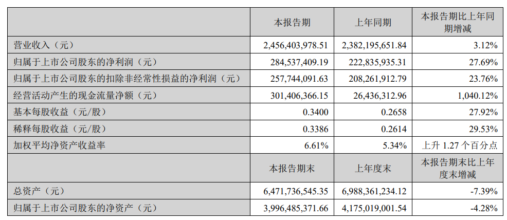 报告期内,罗莱生活实现营业收入24.56亿元,同比增长3.12%;归属于上市公司股东的净利润为2.85亿元,同比增长27.69%;归属于上市公司股东的扣非净利润为2.58亿元,同比增长23.76%。