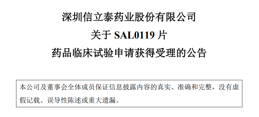 11月21日,信立泰发布公告,其自主研发的1类新药SAL0119片临床试验申请获药监局受理。