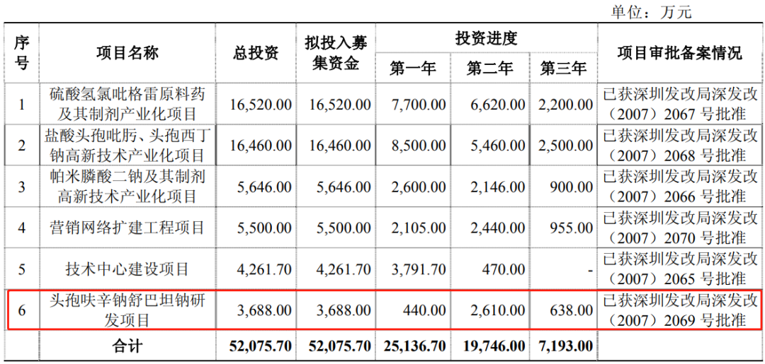 在那个抗生素盛行的年代,抗生素类成为大品类产品,因此信立泰也将目光放到了这一领域,希望复制泰嘉的成功。募资项目中的头孢呋辛钠舒巴坦钠在当时还是国内外都没上市的新型抗生素组合物,属于国家一类新药项目,还获得国家发明专利,并在2007年末拿到临床试验批件并进行临床试验。