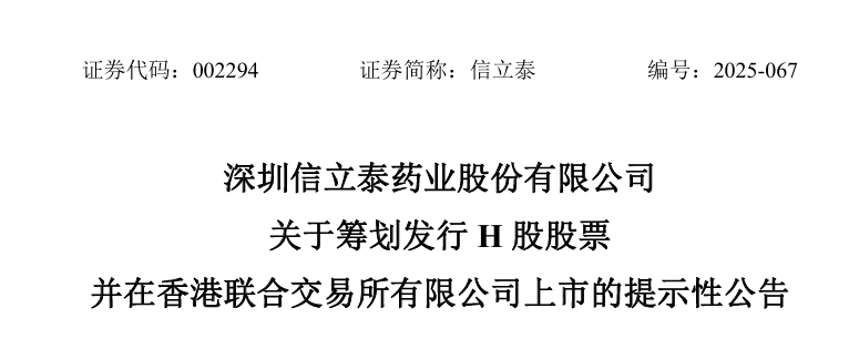 来自深圳福田区的A股上市公司 信立泰 (002294.SZ)发布公告称,为进一步推进公司全球化战略布局,打造国际化资本运作平台,助力公司高质量发展,公司正在筹划发行境外股份(H股)并在 香港联合交易所有限公司 上市事宜。截至本公告披露日,公司正与相关中介机构就本次发行上市的具体推进工作进行商讨,相关细节尚未确定,本次发行上市不会导致公司控股股东和实际控制人发生变化。