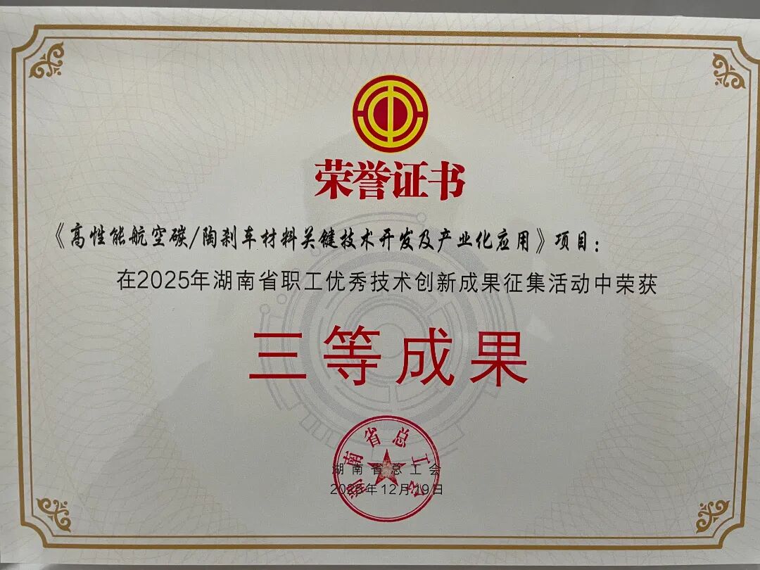12月19日,湖南省职工优秀创新成果评选结果公布,公司沈益顺团队的《高性能航空碳陶刹车材料关键技术开发及产业化应用》项目获三等成果奖,彰显公司在先进航空材料领域的技术实力。
