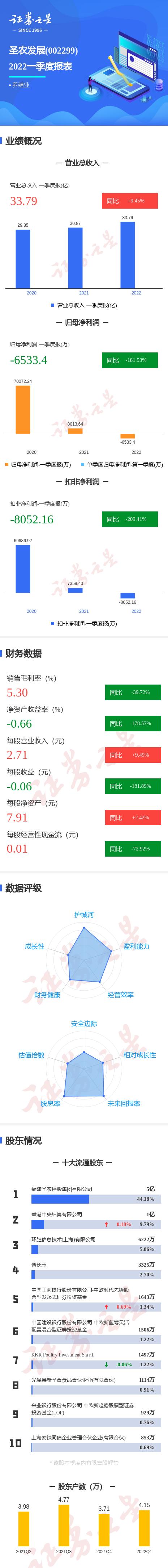 圣农发展2022一季报显示,公司主营收入33.79亿元,同比上升9.45%;归母净利润-6533.41万元,同比下降181.53%;扣非净利润-8052.17万元,同比下降209.41%;其中2022年第一季度,公司单季度主营收入33.79亿元,同比上升9.45%;单季度归母净利润-6533.41万元,同比下降181.53%;单季度扣非净利润-8052.17万元,同比下降209.41%;负债率47.67%,投资收益785.84万元,财务费用3745.95万元,毛利率5.3%。