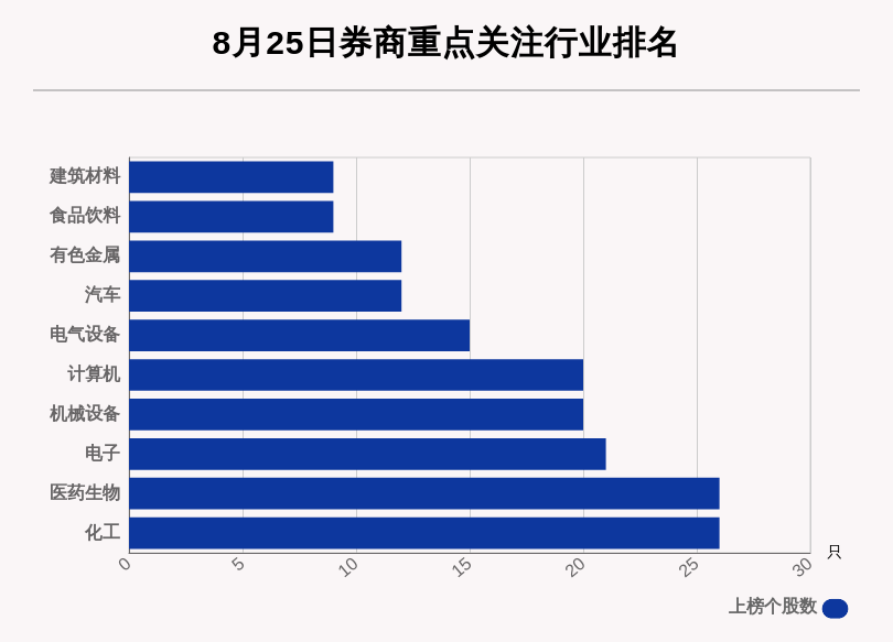从券商对行业的关注度来看,券商关注个股数居前的行业分别是化工、医药生物、电子。