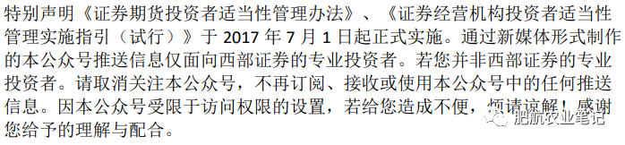 本公众号推送内容仅面向西部证券股份有限公司(以下简称“西部公司”)机构客户,请勿对本公众号内容进行任何形式的转发。若您并非西部证券机构客户,请取消关注本公众号,不再订阅、接收或使用本公众号中的内容。因本公众号难以设置访问权限,若给您造成不便,烦请谅解!西部证券不会因订阅本公众号的行为或者收到、阅读本公众号推送内容而视相关人员为客户。