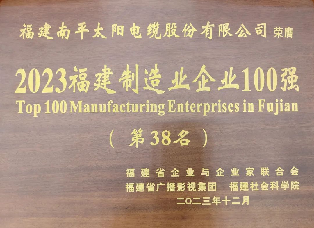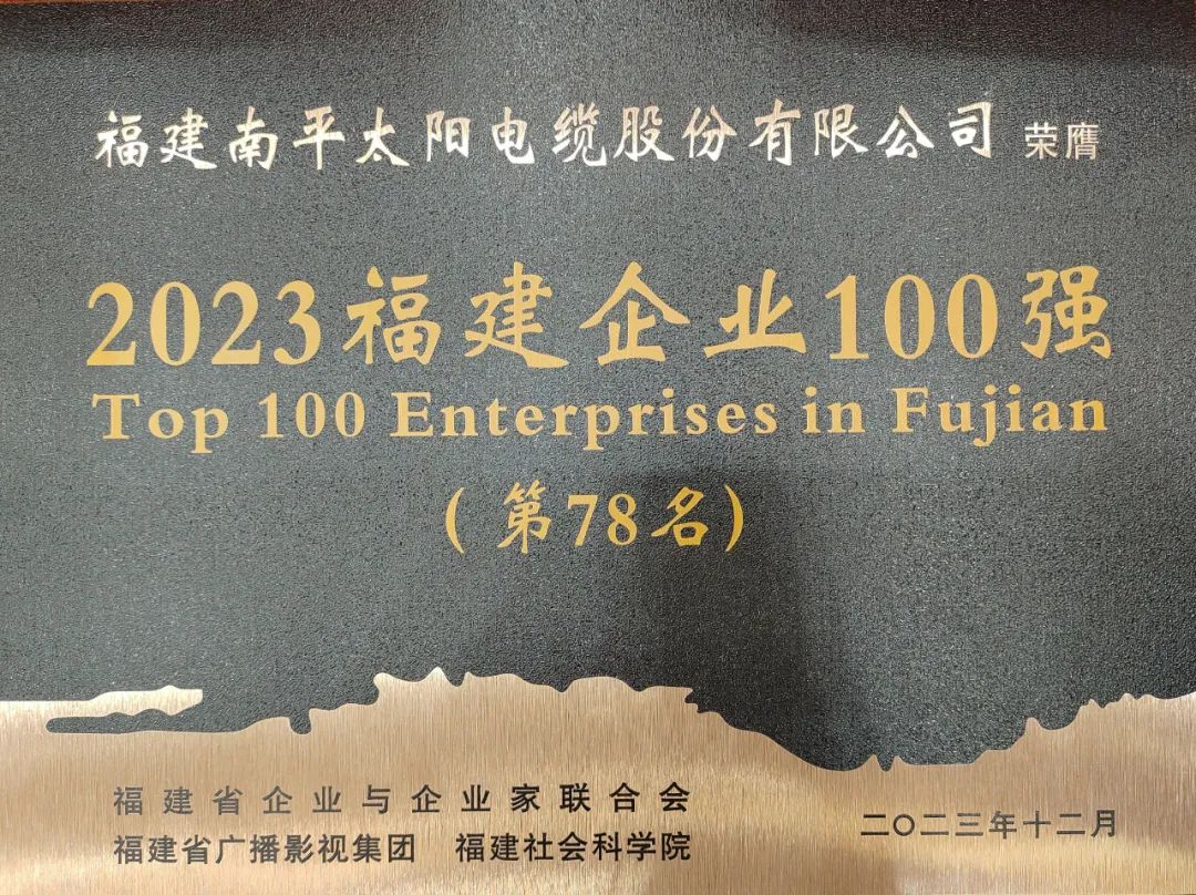 近日,由福建省企业与企业家联合会和福建省广播影视集团、福建社会科学院联合开展的2023福建企业100强研究排序发布,太阳电缆荣膺2023福建企业100强、福建制造业企业100强。