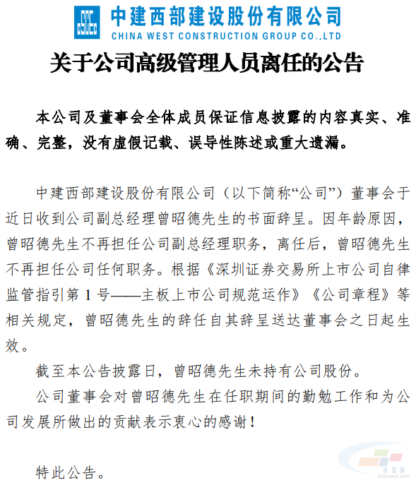 公告中显示,中建西部建设股份有限公司董事会于近日收到公司副总经理曾昭德先生的书面辞呈。因年龄原因,曾昭德先生不再担任公司副总经理职务,离任后,曾昭德先生不再担任公司任何职务。