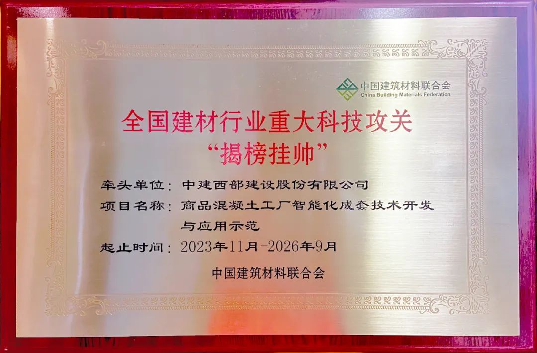 为深入贯彻落实习近平总书记关于科技创新的重要指示精神,引导全行业围绕国家和行业重大战略亟需,开展前瞻性、原创性、颠覆性的科技攻关,中国建筑材料联合会发布了第三批全国建材行业重大科技攻关“揭榜挂帅”项目榜单,以无机非金属“超级材料”、“六零”示范工厂为主攻方向,共包含34个攻关项目。榜单发布后得到行业内外有关企业和单位的积极响应,中建西部建设凭借在预拌混凝土智能制造工厂建设方面的丰富实践基础脱颖而出,得到了专家评审的一致认可。经中国建筑材料联合会研究决定,同意由中建西部建设作为揭榜单位承担《商品混凝土工厂智能化成套技术开发与应用示范》项目。