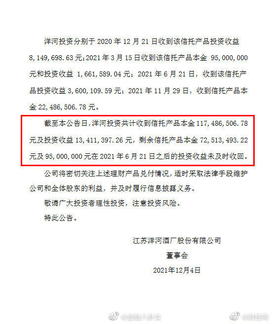 12月4日,洋河股份公告,去年5月出资1.9亿元,认购投向恒大贵阳一项目的信托产品,如今7251万本金及部分投资收益到期无法兑付。与多数上市公司偏好低风险银行理财不同,洋河股份近年酷爱信托理财,2020年年报显示其持有信托产品余额121亿元,而银行理财仅有39亿元。#洋河股份1.68亿恒大信托产品本息未兑付#