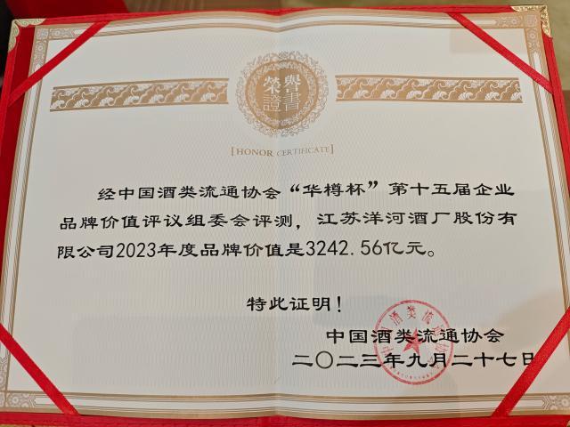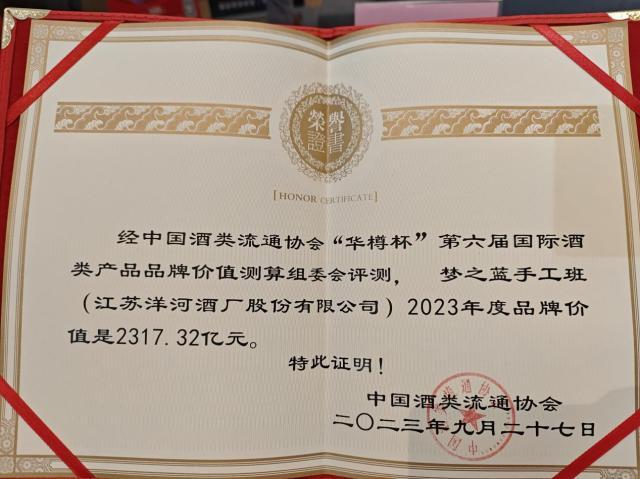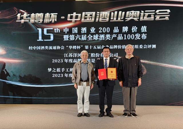 江苏洋河酒厂股份有限公司以3242.56亿元的品牌价值,位列“第十五届中国酒类企业品牌价值200强”第四名,白酒类第三。梦之蓝·手工班以2317.32亿元的产品品牌价值,位列“全球名酒品牌价值100强”第四名,白酒类第三名。