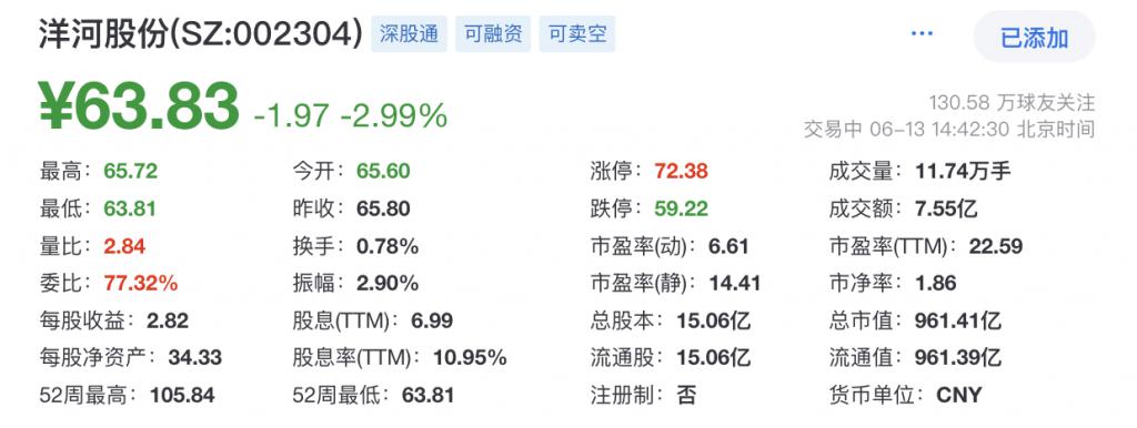 股价方面,2021 年 1 月 5 日,洋河股份股价来到历史高位,当天收盘价一度高达 228.39 元/股。但此后股价震荡下跌。截至发稿,洋河股份股价跌 2.99%,报 63.83 元/股,股价相较高点时的 228.39 元/股已缩水约 72.05%,公司如今总市值为 961.39 亿元。