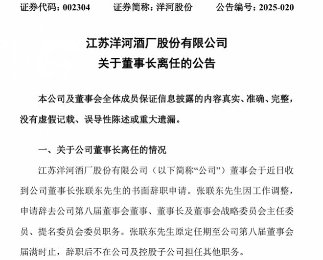 7月1日,洋河股份发布关于董事长离任的公告。公告提到,洋河董事会于近日收到公司董事长张联东先生的书面辞职申请。张联东因工作调整,申请辞去公司第八届董事会董事、董事长及董事会战略委员会主任委员、提名委员会委员职务。张联东原定任期至公司第八届董事会届满时止,辞职后不在公司及控股子公司担任其他职务。