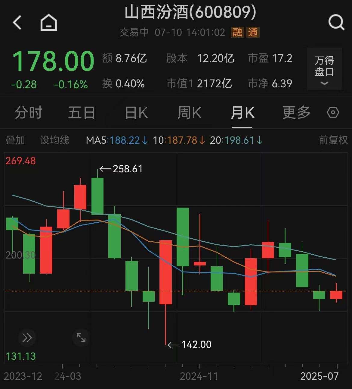 不过从市场表现看,2024年7月1日~2025年6月30日,山西汾酒股价累计跌幅超过10%,股价表现远逊于贵州茅台(同期跌幅0.45%)和五粮液(同期跌幅1.56%)。