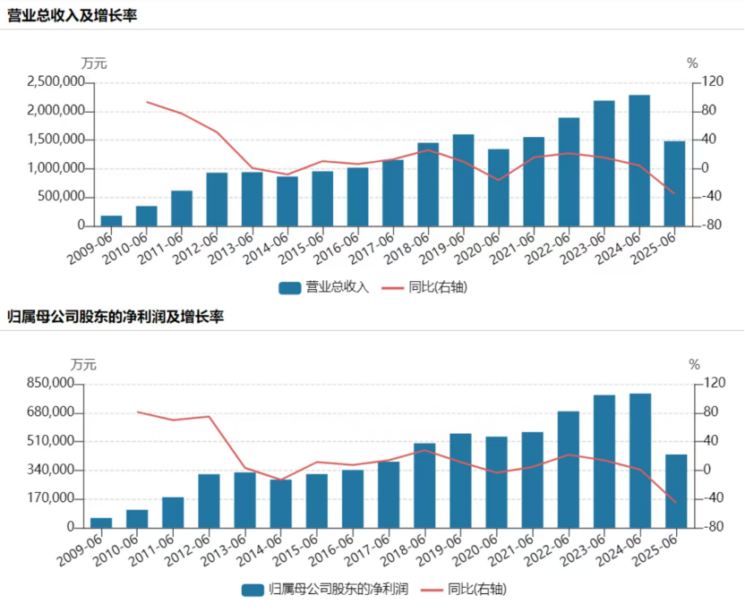 8月18日晚间,江苏洋河酒厂股份有限公司(股票代码:002304.SZ)披露了2025年中期业绩报告。财报显示,上半年公司共实现营收147.96亿元,同比下降35.32%;归母净利润43.44亿元,同比大跌45.34%。