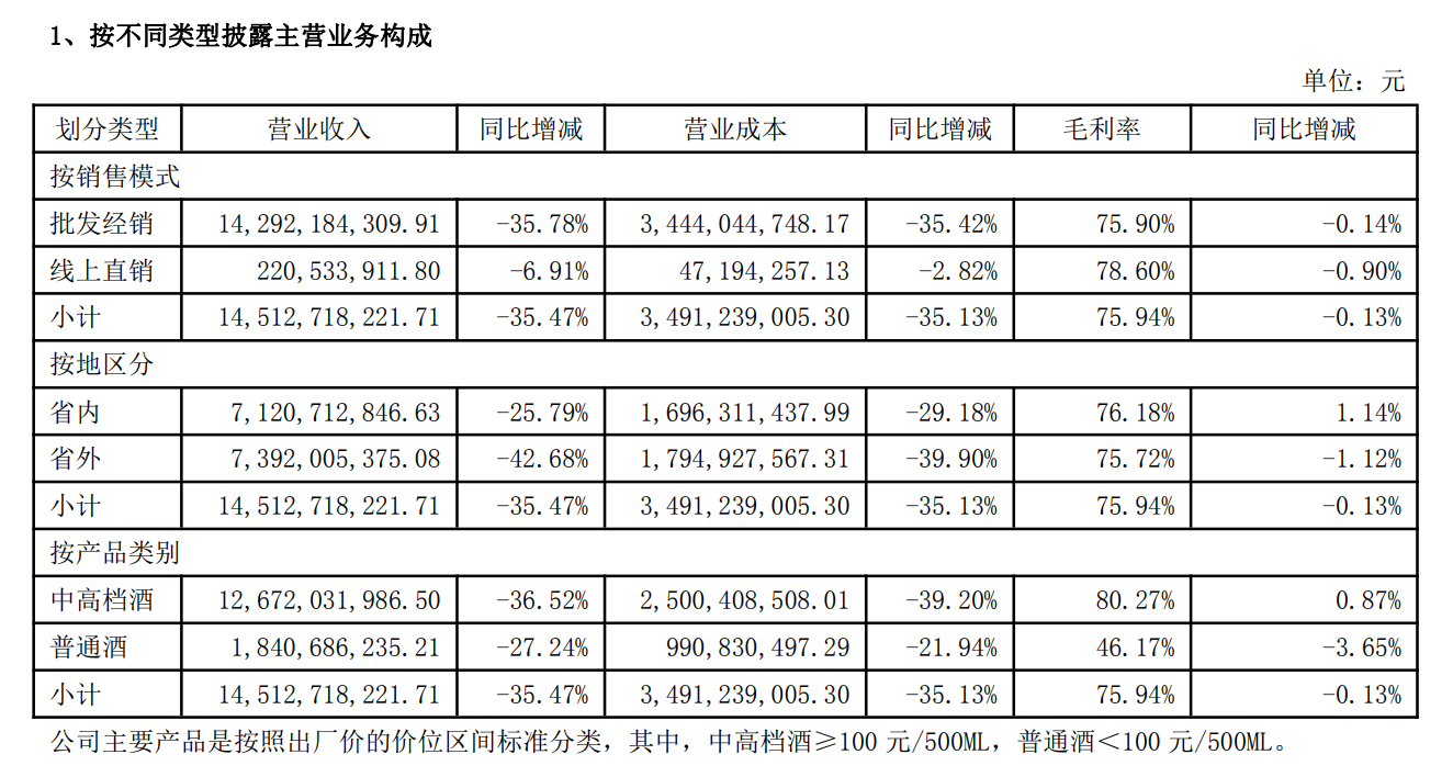其次,洋河渠道体系的松动,成为其此轮危机的放大器,经销商们的“离心力”似乎与日俱增。财报显示,上半年洋河的经销商总量合计为8609个,减少257个,其中省外经销商数量净减少268家,省外市场营收73.9亿元,同比暴跌42.7%,远超省内25.8%的降幅。若以每家经销商贡献约132万元营收计算,仅渠道收缩就直接导致逾3.5亿元收入蒸发。